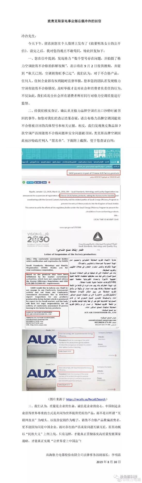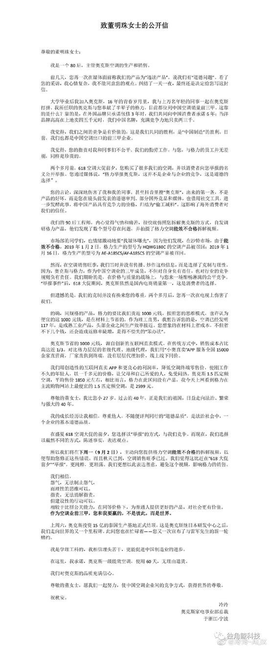 8月30日傍晚,奥克斯家电事业部总裁冷泠在个人微博上发布了《致董明珠女士的公开信》,对董明珠指控奥克斯产品违法是道德问题表示不认同。此外,提到格力出口沙特的空调产品不合格被召回;将于9月2日公布不合格产品的拆解视频。