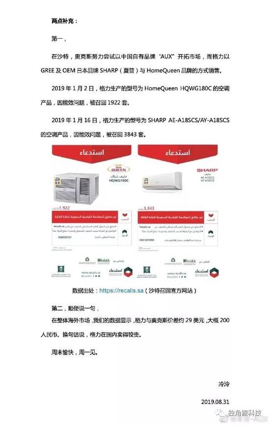 李明晶还提到,格力发现奥克斯品牌7款空调产品因能效不合格问题和安全问题被召回,奥克斯品牌空调因此被沙特政府列入“黑名单”。