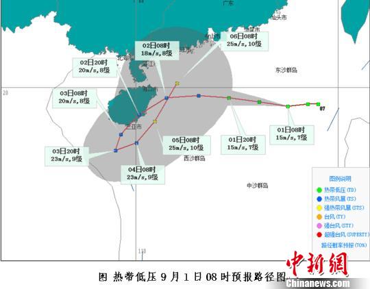据海南省气象部门介绍,南海热带低压已于8月31日20时生成,9月1日8时中心在陵水县偏东方大约790公里的南海东北部洋面上。预计,该低压可能于未来24小时内加强为台风(热带风暴级)。海南省气象局9月1日5时40分发布台风四级预警。