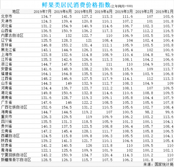 从各省份来看,无论是猪肉还是水果,有的省份出现大幅上涨。