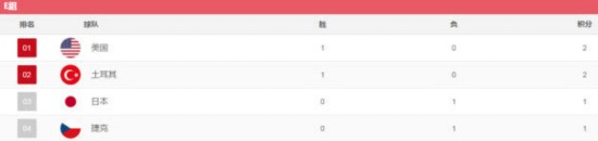 E组,美国队和土耳其队排名第1和第2。美国队不出意外将提前锁定小组第一,土耳其队在轻取日本队后接下来和捷克队的对决将影响最终的晋级形势。首场比赛就遭遇惨败的日本队,已经基本上看不到晋级的机会。