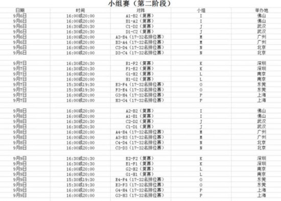 分组的原则是临近的两个小组组成一组,比如复赛阶段,A组的前两名和B组的前两名组成复赛的I组,C组的前两名和D组的前两名组成J组,E组和F组各自的前两名组成K组,G组和H组的前两名组成L组。排位赛亦是如此,A组和B组各自的后两名组成M组,C组和D组的后两名组成N组,E组和F组的后两名组成O组,G组和H组的后两名组成P组。其中,I组、J组、K组和L组的比赛分别在佛山、武汉、深圳和南京举行,M组、N组、O组和P组的比赛分别在广州、北京、东莞和上海举行。