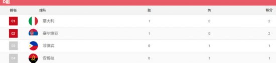 D组,意大利队和塞尔维亚队分列第1和第2,两队都在第一场取得了46分的大胜,但因为意大利队首场比赛得分更高轰下108分高于塞尔维亚队(105分),故而他们暂时力压夺冠热门塞尔维亚队。该小组,菲律宾队和安哥拉队实力孱弱,根本不足以阻挡塞尔维亚和意大利。