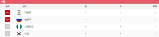 B组,阿根廷队和俄罗斯队目前分别排名第1和第2,尼日利亚队和韩国队分列第3和第4。在该小组,韩国队的实力最弱,接下来无论是面对欧洲劲旅俄罗斯还是非洲雄鹰尼日利亚,取胜的可能都不大,首战就惨败阿根廷队26分的韩国队想赢一场非常难。但在俄罗斯队首战5分小胜尼日利亚队后,他们和阿根廷的对决还有悬念,哪两支球队晋级形势还不算特别明朗。
