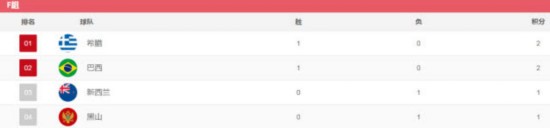 F组,字母哥带领的希腊队排名第1,巴西队位列第2。排名第4的黑山队虽然拥有NBA优质中锋武切维奇,但他们的整体实力和强队的差距仍然明显。巴西队在击败强劲对手新西兰队后,和希腊队联手出线的形势比较乐观。
