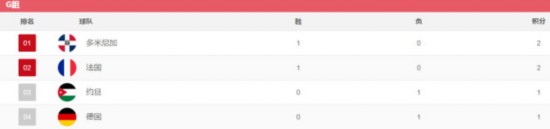 G组,多米尼加队暂时力压法国队排名第1,但这只是暂时的,因为他们击败的是小组最弱的约旦队。多米尼加队的整体实力仍然相较法国和德国存在差距,德国队在首战只输给法国队4分后证明了他们不容小觑,接下来的比赛,德国队必须击败多米尼加和约旦才能出线,约旦小组垫底已是大势所趋。
