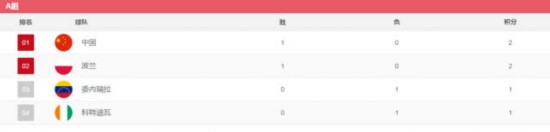 小组赛阶段,赢球积2分、输球积1分。中国男篮所处的A组内,中国和波兰都拿到了开门红、积分都是2分,但中国队靠着更高的得失分差(15)力压波兰(11)排名小组第1。委内瑞拉队和科特迪瓦队分列小组第3和第4。只要在接下来的两场小组赛中赢下一场,中国男篮能便可小组出线、晋级复赛,波兰队亦是如此。