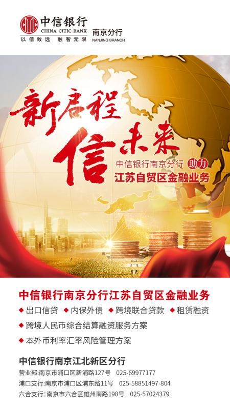 作为江苏地区最早建立普惠金融一级部的全国性股份制商业银行,中信银行南京分行从“专人、专职、专心、专项、专注”工作理念入手,出台多项措施,全面系统化构建普惠金融服务体系,打造出了江苏“普惠金融”服务的中信样本,随着自贸区的成立,南京分行必将会更加关注南京江北新区内众多初创企业的金融服务需求,在人力资源、信贷资源等方面都会加大投入,助力江苏自贸区建设。