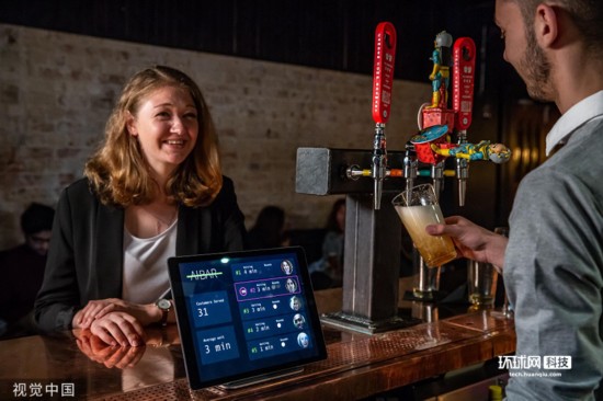 2019年8月30日讯(具体拍摄时间不详),英国,为了避免酒吧里插队拿酒的现象,DataSparQ公司专门为酒吧研发了一款“人工智能吧”。