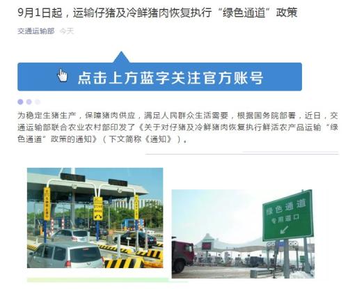 《通知》指出,从2019年9月1日起,对整车合法运输仔猪及冷鲜猪肉的车辆,恢复执行鲜活农产品运输“绿色通道”政策。同时,在2019年9月1日至2020年6月30日期间,对整车合法运输种猪及冷冻猪肉的车辆,免收车辆通行费。
