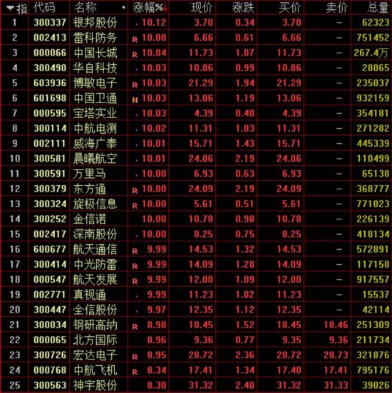 盘面上,各大行业板块全线上涨。军工股掀涨停潮,银邦股份、雷科防务、中国长城、华自科技、中国卫通等20余股集体封板。