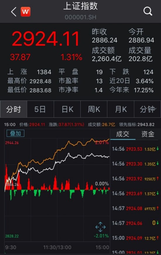 截至收盘,沪指报2924.11点,涨1.31%,成交2260亿元;深成指报9569.47点,涨2.18%,成交3272亿元;创业板指报1652.29点,涨2.57%,成交1128亿元。A股三大指数日线均终结三连阴。