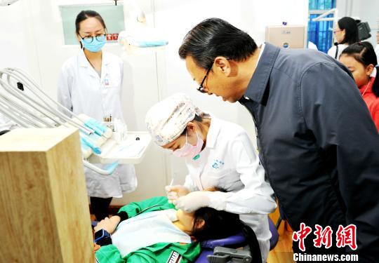 图为青海省关工委主任白玛等看望接受口腔健康检查的青少年。朱建军 摄