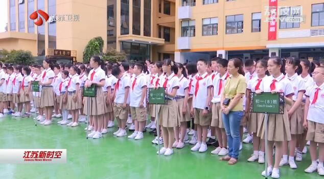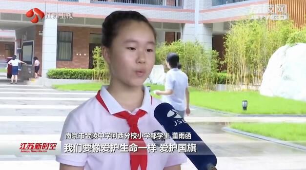 江苏台记者高涵:“在南京金陵中学河西分校,一场以‘五星红旗,我爱你’为主题的开学典礼正在进行中,来自小学部的同学们高举着一面巨大的五星红旗,表达出对祖国的浓浓爱意。”