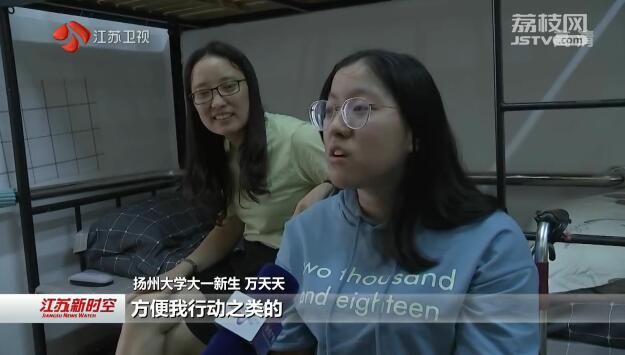 扬州大学大一新生万天天:“都挺好的,学校还专门让学姐来帮忙布置宿舍,学校也安排人弄这些设施,方便我行动之类的。”