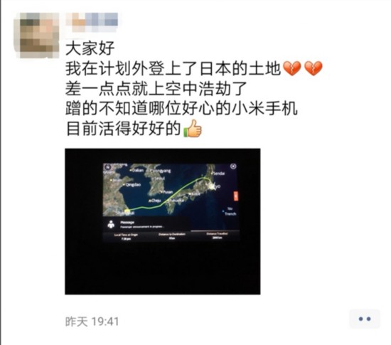 飞机备降成田机场后,该名乘客发布的朋友圈动态。受访者提供 华龙网发
