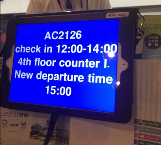 日本当地时间20时28分左右,飞机降落成田机场,随后机组人员立即联系了机场的负责人,对此次紧急降落进行后续的一系列安排。张女士表示,由于是紧急降落,乘客们在飞机上等待两个多小时后,才在机场人员的引导下排队办理了入境和入住。同时现场的指示牌上,也对后续的起飞安排进行了说明——“New departure time 15:00”。