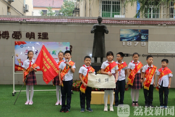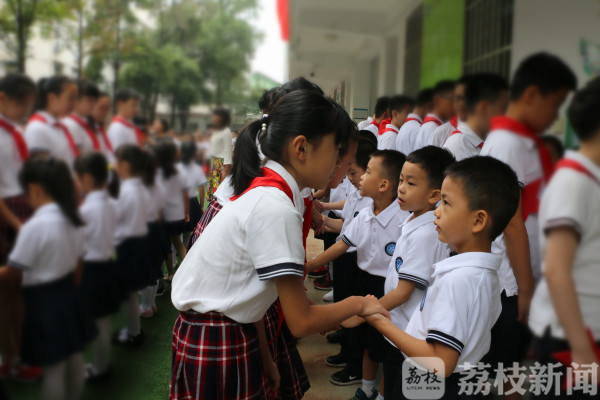 南京市逸仙小学举行“我和祖国共成长”主题开学典礼,大手拉小手环节,六年级为一年级新生佩戴纪念手环。雏鹰假日小学的学生们讲述暑假寻访见闻。学校大队辅导员刘媛媛说,全校有三十多个小队,分为爱国、环保等不同主题。“暑假期间,四(2)中队七彩阳光雏鹰假日小队来到孙中山纪念馆开展寻找中山记忆,诵读爱国诗歌活动。他们不仅在鲜艳的五星红旗下诵读《我骄傲,我是中国人》,还亲自体验了用古代雕版印刷术印制‘博爱’两个字。通过这次参观,他们深刻地感悟到,铭记历史,缅怀先辈,方可走得更远。”