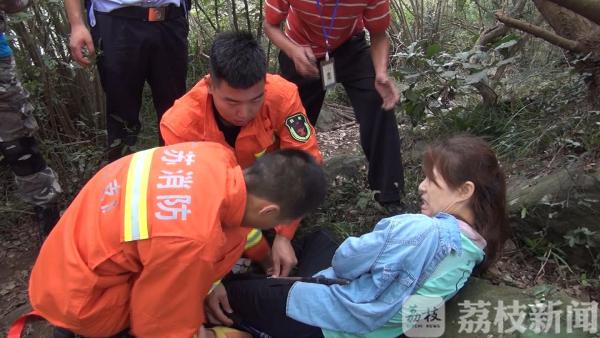 消防人员到场后发现,在通往山顶的窄道上,一名女子躺在路边的大石头上,表情痛苦地等待救援人员的到来。现场了解,女子在登到山顶后返回时不慎失足滑倒,大腿撞到了凸出的山石上导致骨折,现在无法动弹。消防救援队员和医护人员到场后对受伤女子腿部进行检查和包扎,消防队员将她固定在担架上。