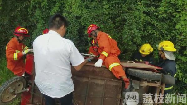 消防救援人员赶到现场后,发现一辆全封闭电动三轮车侧翻到路边沟里,一名老人瘫坐在车中不能动弹。了解情况后,救援人员立即组织救援。
