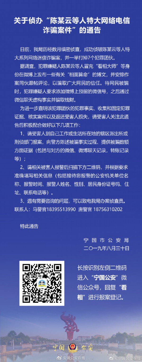 近日,安徽省宁国市公安机关成功侦破特大系列网络迷信诈骗案,一举打掉7个犯罪团伙,抓获涉案人员100名,涉案金额逾5000万元。这些团伙作案手法相似,打着文化传媒公司的幌子,通过“看相禅师”等微博“大V”号广发热点评论,再利用微信号冒充“大师”行骗,屡屡得手。
