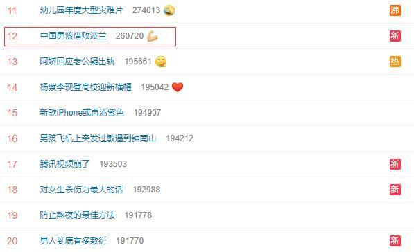 9月2日,2019篮球世界杯进入第三比赛日,小组赛中国男篮迎战波兰。双方全场胶着,中国男篮关键时刻出现了多次致命失误,最终中国男篮加时76-79不敌波兰。这场比赛引发了国内球迷的强烈关注,据不完全统计,有多达10条与本场比赛相关的关键词跻身热搜榜TOP50,其中“周琦发球失误”更是排名榜首。中国男篮加时惜败波兰 多次致命失误断送好局姚明眼眶含泪中国男篮加时惜败波兰 多次致命失误断送好局姚明眼眶含泪