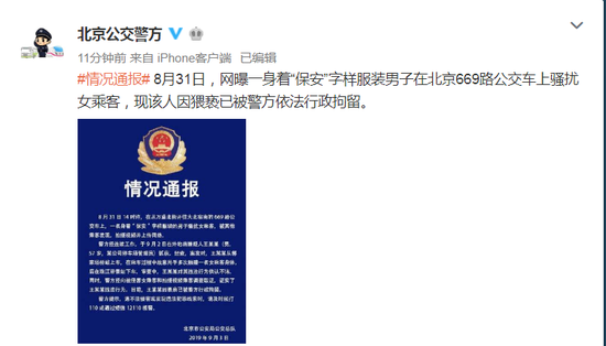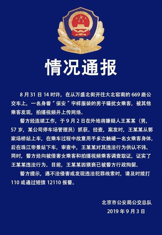 8月31日,网曝一身着“保安”字样服装男子在北京669路公交车上骚扰女乘客,现该人因猥亵已被警方依法行政拘留。