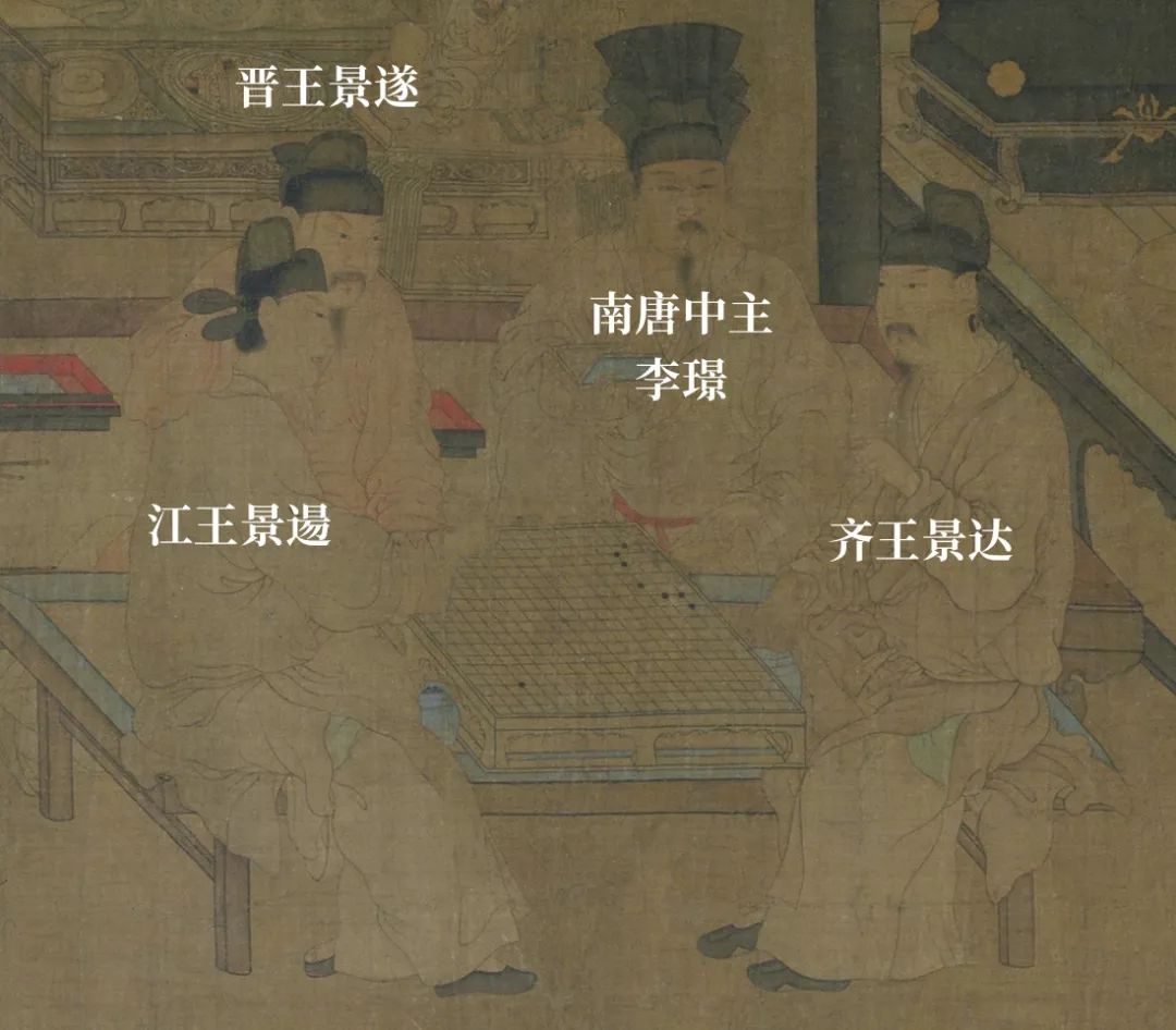 周文矩的画作多以宫廷生活为题材,《重屏会棋图》的中心画面中,四个贵族男子围坐一圈,或对弈,或观棋。但周文矩并未留下人物的具体信息,他们究竟是谁引发了后人猜想。
