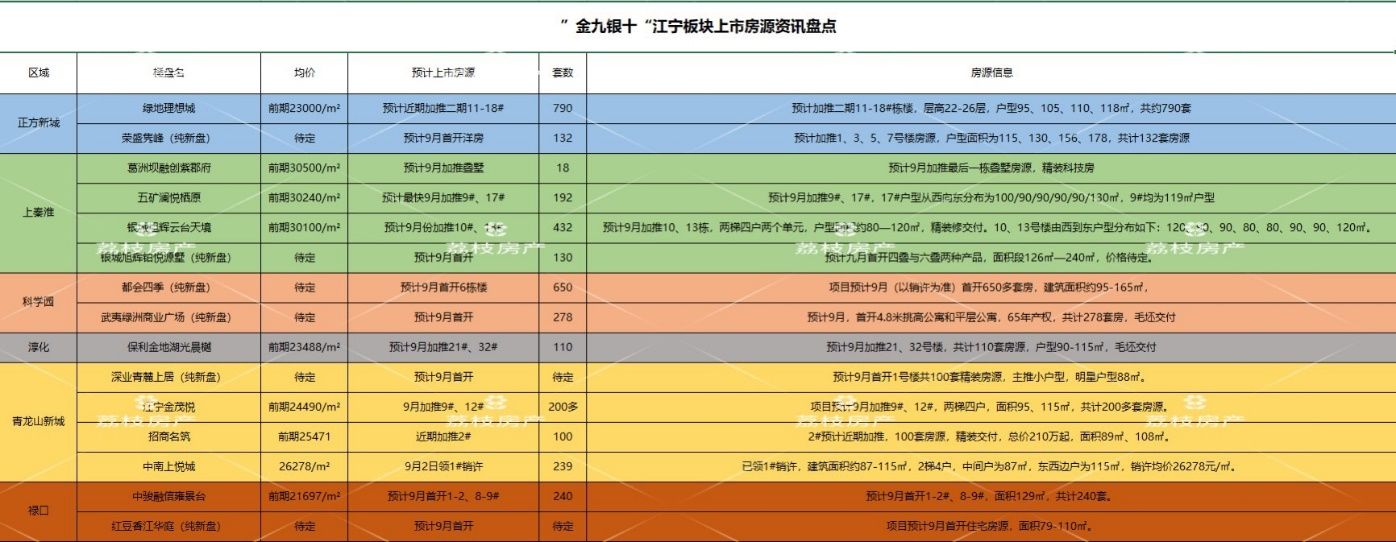 据荔枝房产统计,江宁板块“金九银十”至少有15盘约3769套房源入市,范围涵盖了九龙湖上秦淮、科学园、正方新城、淳化、青龙山新城、禄口板块,呈现遍地开花之势。改善置业者可以着重关注上秦淮和科学园板块;而刚需置业者则可优先考虑正方新城、青龙山新城、淳化和禄口板块。