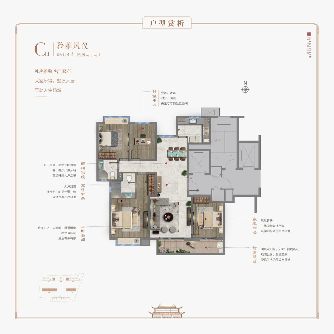 鼓印蘭园规划了建筑面积约127-172㎡的户型空间,其中建筑面积约144㎡的C1、C2是最受追捧的明星户型。整体空间格局方正,南北纵向连贯,四房两厅两卫的规制满足了对生活品质有着高标准的改善群体。同时,入户对景玄关、套房主卧、270°双阳台等一系列豪阔设计,让生活更具品位。C1 户型北面的次卧还设置了飘窗,空间更通透,居住的舒适度也更高。