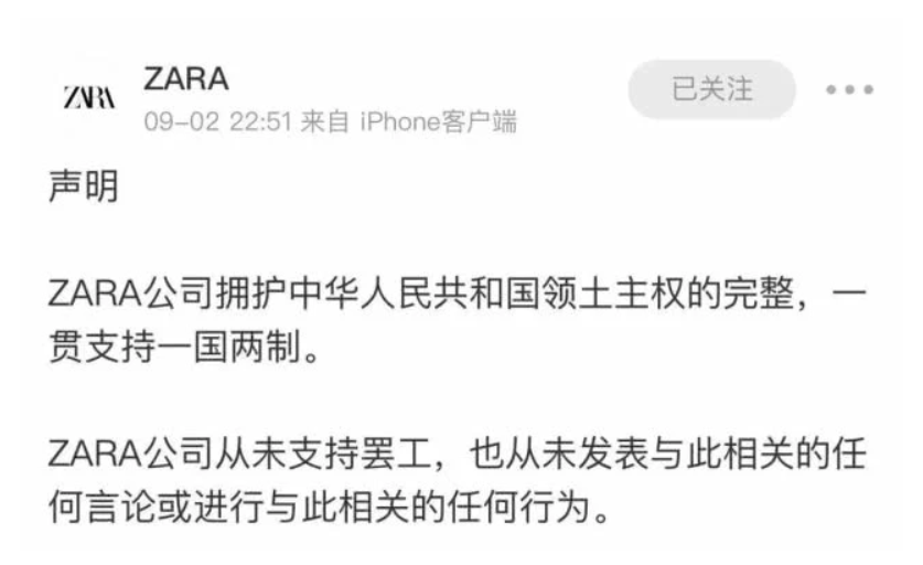 2日晚间,ZARA也曾在其官方微博账号发布声明称,ZARA公司拥护中华人民共和国领土主权的完整,一贯支持“一国两制”。ZARA公司从未支持罢工,也从未发表与此相关的任何言论或进行与此相关的任何行为。但许多中国民众对这种“撇清”并不买账。有网友随即质疑,ZARA为何不在国外社交媒体和香港媒体发声明?