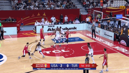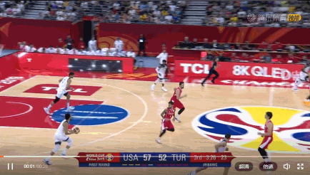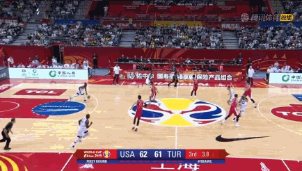第三节前半段,美国男篮的进攻打得并不好,以至于在他们的一次进攻中,现场球迷还发出了嘘声,而美国男篮那次进攻也打得毫无章法,最终米切尔强投三分不中,现场球迷又响起了掌声。土耳其男篮打反击得手,将比分追至52-53。之后洛佩兹罚中一球,接着米德尔顿命中三分,美国男篮才稳住了局势。但土耳其男篮毫不示弱,奥斯曼在打进一球后又罚中两球,接着他又助攻科尔克马兹命中三分,土耳其男篮将比分追至59平。