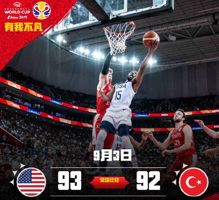 腾讯体育消息,9月3日,2019篮球世界杯进入到第四个比赛日,在E组的一场小组赛中,美国迎战土耳其。常规时间内双方战平,土耳其在加时赛关键时刻连续四罚不中,最后依靠米德尔顿的罚球绝杀,美国93-92险胜土耳其,提前一场小组出线,并获得世界杯比赛的21连胜。详情>>