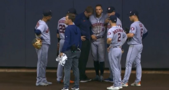 五局下半, 虽然斯普林格抓到第三个出局数,但是起跳接球落地后,头部撞在了本垒打墙的护垫上,太空人队不得已将他换下。五局结束,酿酒人队4-1领先太空人队。