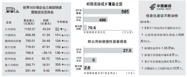 中国邮政抓住国家深化邮政体制改革的机遇,坚持科技兴邮,推行专业化经营、多元化发展,极大地解放和发展了生产力,实现了跨越式发展。2011年,中国邮政首次登上世界500强排行榜,当时的排名是第343位,今年已跃升至101位,共提升242个名次。2018年,中国邮政总营业收入为856.28亿美元,同比增长16.2%,邮务板块创新发展、金融板块健康发展、寄递板块转型发展。