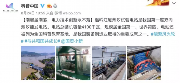 温岭江厦潮汐试验电站总装机容量4100千瓦,是目前我国最大、世界第四的潮汐能发电站。该电站的投产发电还作为发生在20世纪的世纪性大事,被镌刻在北京中华世纪坛的青铜甬道铭文中,备受瞩目。