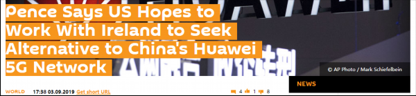 美国9月2日和波兰签署所谓的“5G安全声明”,强调将“严格控制5G网络设备供应商”,将矛头剑指华为和中国其他网络通讯供应商。随后,美国副总统彭斯(Mike Pence)3日赶赴爱尔兰,继续游说爱尔兰和欧洲各国严防华为5G。