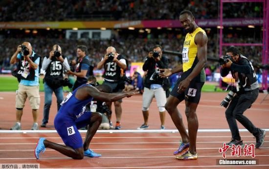资料图:2017年伦敦田径世锦赛,牙买加“闪电”博尔特在决赛中跑出9秒95的成绩收获铜牌,35岁的美国名将加特林9秒92夺冠,终于圆了自己在大赛上战胜博尔特并夺冠的梦。赛后,加特林在即将退役的博尔特面前“跪下”,表达敬意。