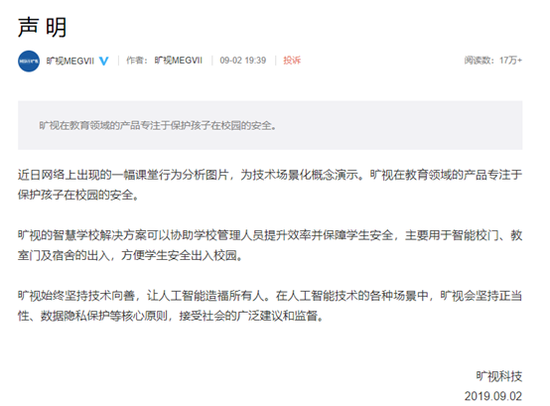 这张照片引起了网友们的热议,大多网友指责并质疑这种技术在课堂上的应用是否侵犯隐私,并把这套人脸识别系统的开发者——旷视科技推上了风口浪尖。