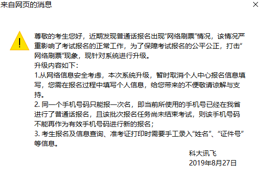 9月5日,记者登录四川省普通话水平测试在线报名系统,相关页面弹出系统开发方科大讯飞公司的一则消息。消息称:近期发现普通话报名出现“网络刷票”情况,该情况严重影响了考试报名的正常工作,为保障考试报名的公平公正,打击“网络刷票”,现针对系统进行升级”。