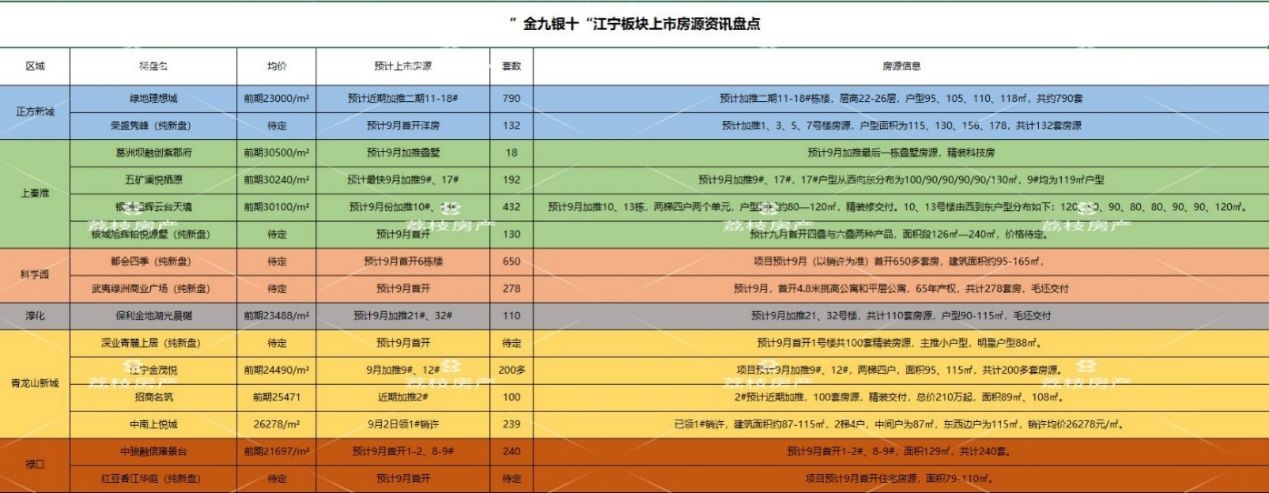 9月3日,荔枝楼市为各位购房者盘点了江宁板块“金九银十”即将上市房源的相关信息。据荔枝楼市统计,江宁板块“金九银十”至少有15盘约3769套房源入市,范围涵盖了九龙湖上秦淮、科学园、正方新城、淳化、青龙山新城、禄口板块,呈现遍地开花之势。改善置业者可以着重关注上秦淮和科学园板块;而刚需置业者则可优先考虑正方新城、青龙山新城、淳化和禄口板块。 >>>新闻链接:【楼市“金九银十”买哪里?做好功课别踩雷!——江宁篇】