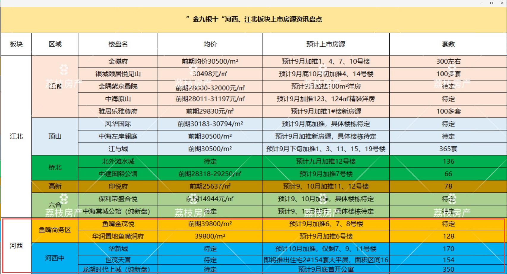 据荔枝楼市统计,“金九银十”河西板块即将加推的楼盘包括鱼嘴商务区及河西中区域。