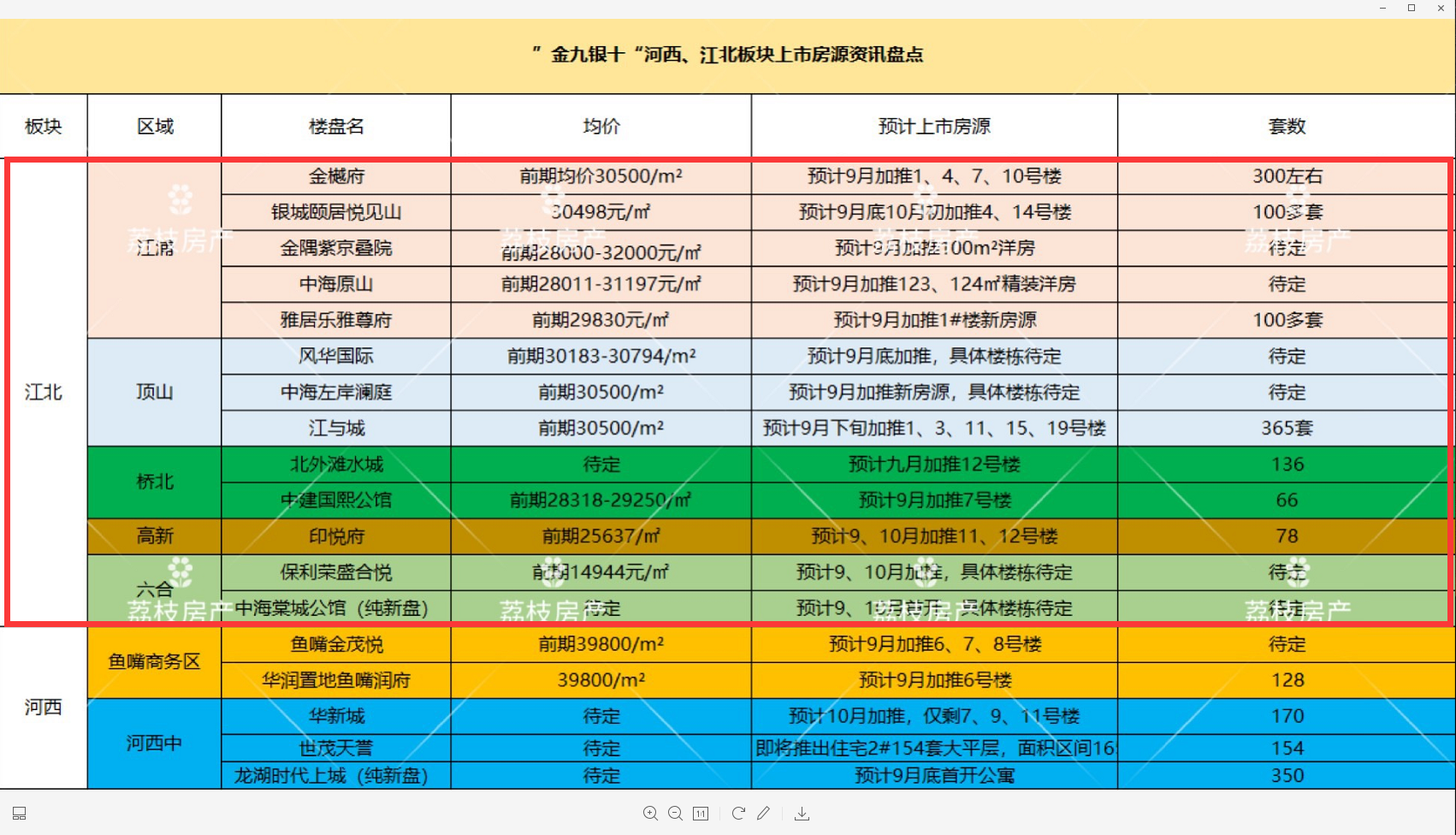 整体上看,本次“金九银十”江北楼市预计推出近千套房源。涵盖江浦、顶山、桥北、高新及六合区域。