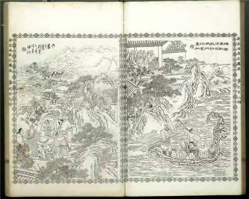 《新说西游记绘像》(清光绪石印本):唐僧取经归来路上,不慎将经书落入水中,捞起后暴晒,才得以保存。