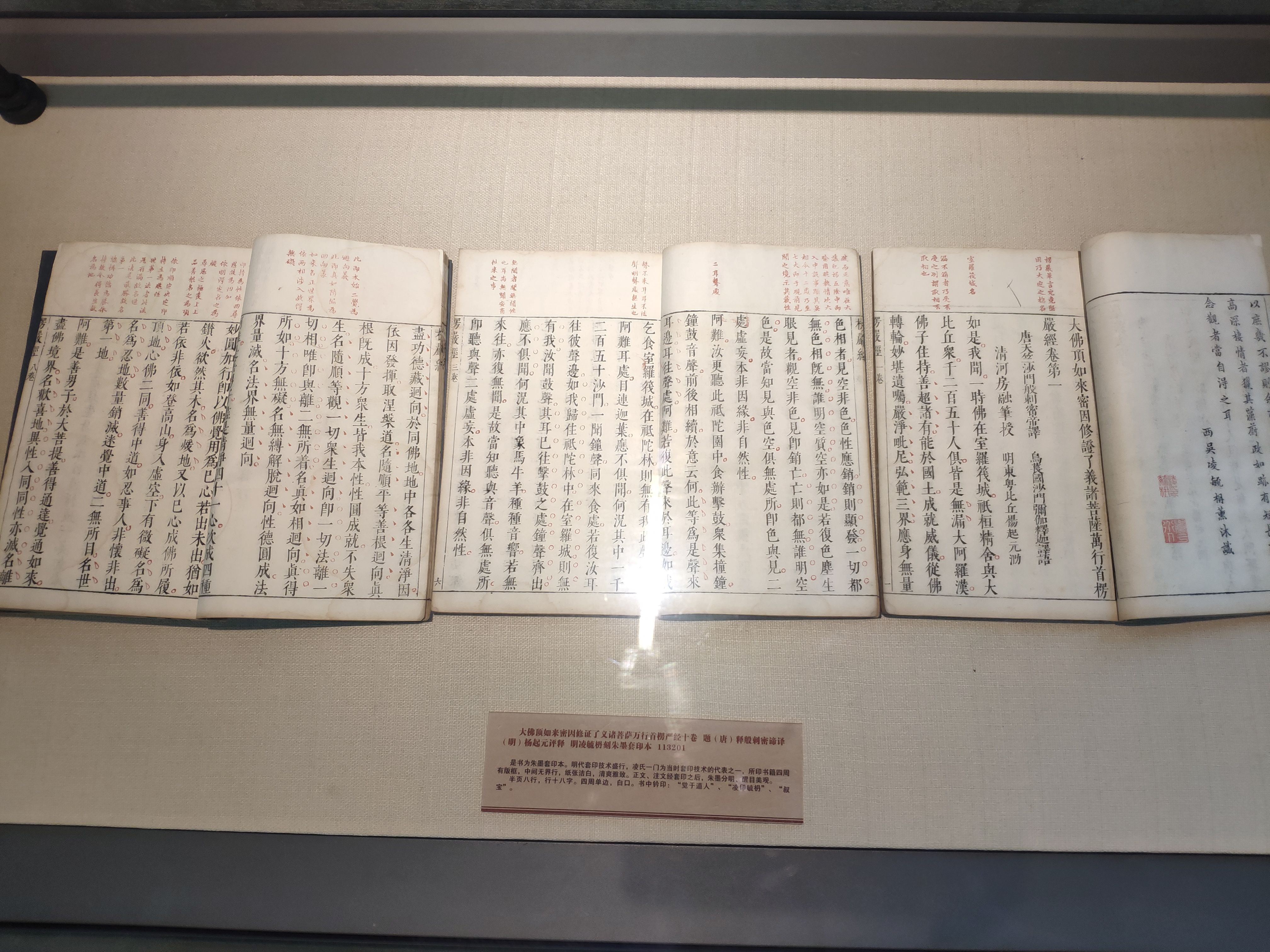 本次展览展出的佛经相当精美,版本丰富各异,既有辽泥金写本、明宣德泥金写本在内的两部写本,还包括朱墨套印本、版画、活字本等多种技术的刻本。