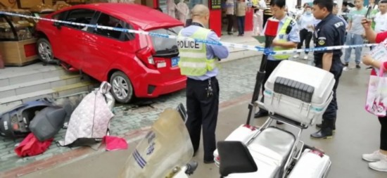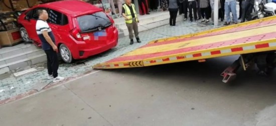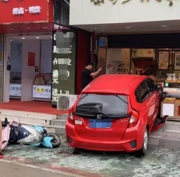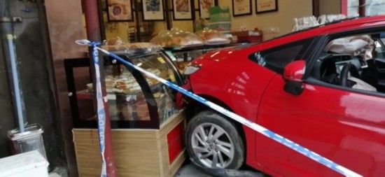 记者赶到现场看到,幸亏糕点店前有几级台阶,轿车只是撞坏柜台,未将柜台撞翻,店里人员受到惊吓,没有受伤。轿车旁边还倒着一辆电动车。