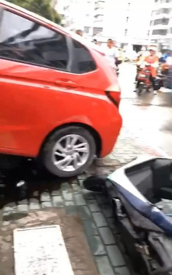9月5日下午1点多,姜堰城区迎宾西路(坊间称香园街),一辆红色轿车突然冲向路边的一间糕点店……