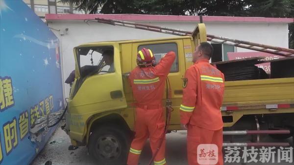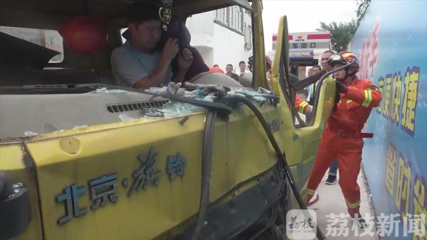 9月6日11点多钟,常州市钟楼区运河路新闸加油站车祸有人被困。一名中年男子被卡货车驾驶室中,消防员立即展开救援,利用液压破拆工具组进行破拆,大约经过十分钟的紧张救援成功将被困男子救出,所幸男子没什么大碍。