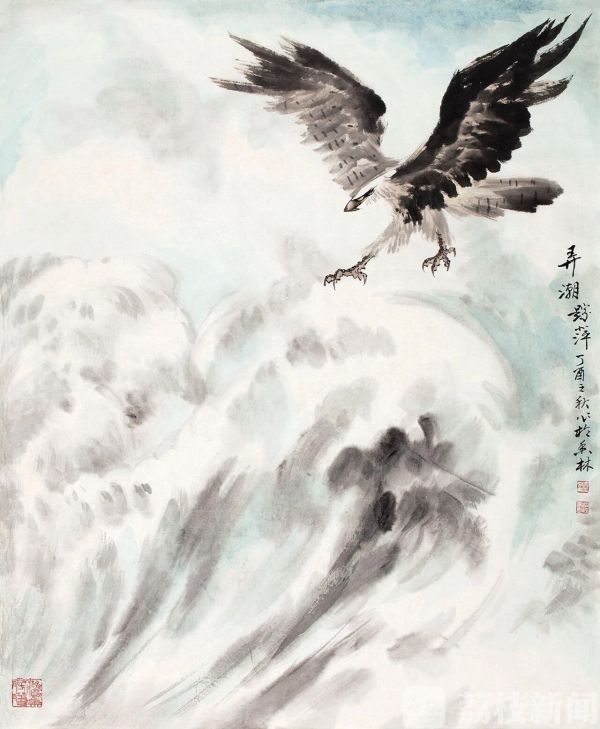 踪萍介绍,老鹰的眼是印象的,不是具象的。现实中老鹰的眼球是圆形,但是圆形很难体现它的感情,凶猛,可以说是我开辟了这个画法的先河。这个创意是,鹰是俯冲的鹰,海浪预示着时代的大潮,要敢于弄潮。