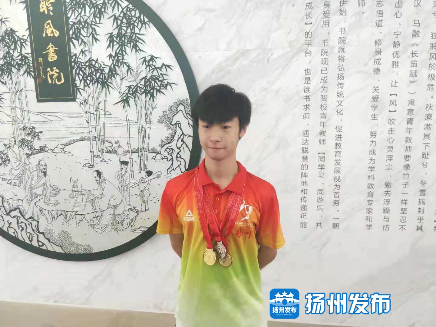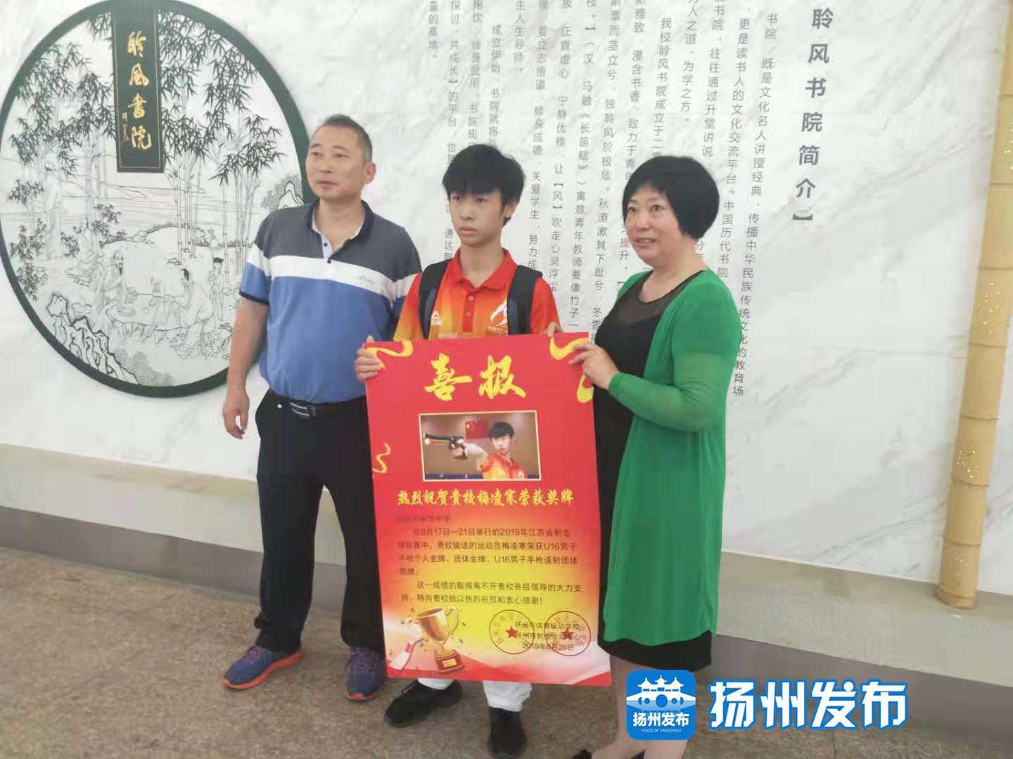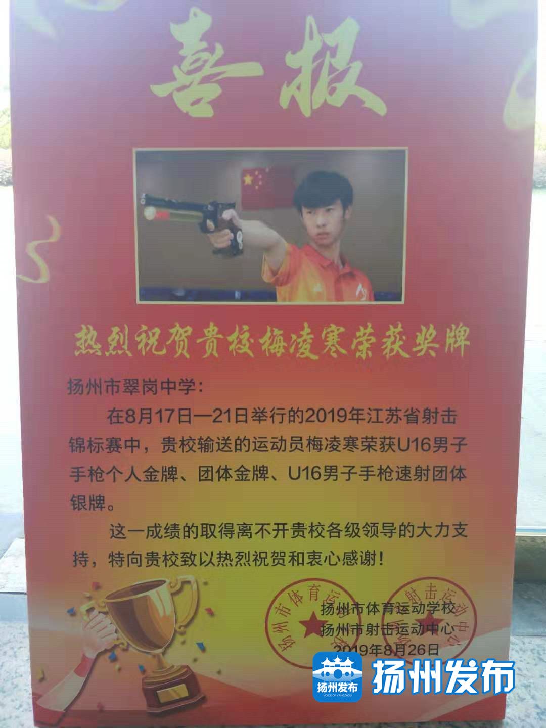 在第35个教师节来临之际,今天上午,一份来自扬州市体育运动学校、扬州市射击运动中心的《喜报》送至翠岗中学。原来,在今年暑假8月17日-21日举行的2019年江苏省射击锦标赛中,翠岗中学输送的运动员梅凌寒荣获U16男子手枪个人金牌、团体金牌、U16男子手枪速射团体银牌。今天,曾在翠岗中学“奔跑吧,七班”就读一年半的梅凌寒穿领奖服、戴奖牌,拿着奖状和喜报,和扬州市射击队的教练宋磊磊一起来到学校,感谢学校输送优秀运动员、感谢老师的关心与大力支持。